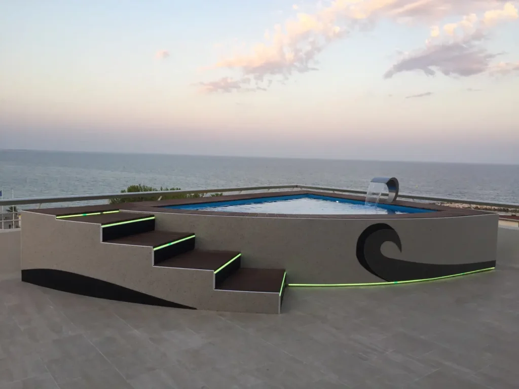 Possible en neuf et rénovation, sur béton ou dalle existante avec la création de margelles personnalisées, La moquette de marbre ne craint ni le gel, ni les projections d’eau.
