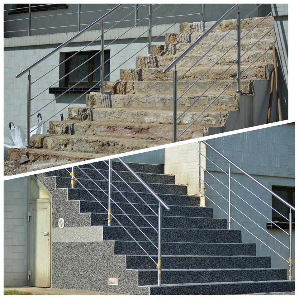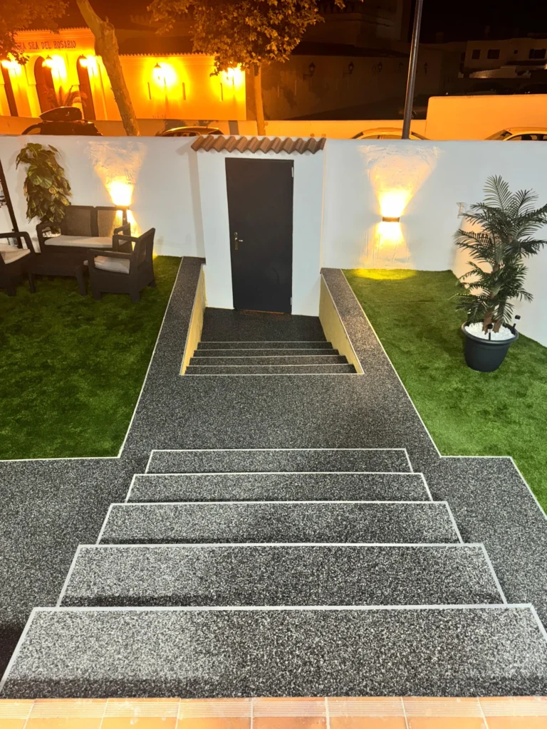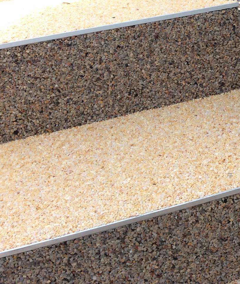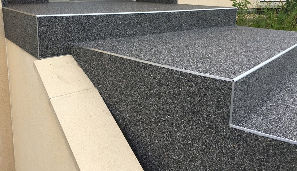 Réalisation d’un escalier en tapis de marbre et revêtement drainant évitant l’eau stagnante et assurant un nettoyage facile, idéal pour votre escalier.