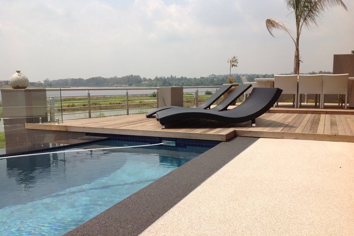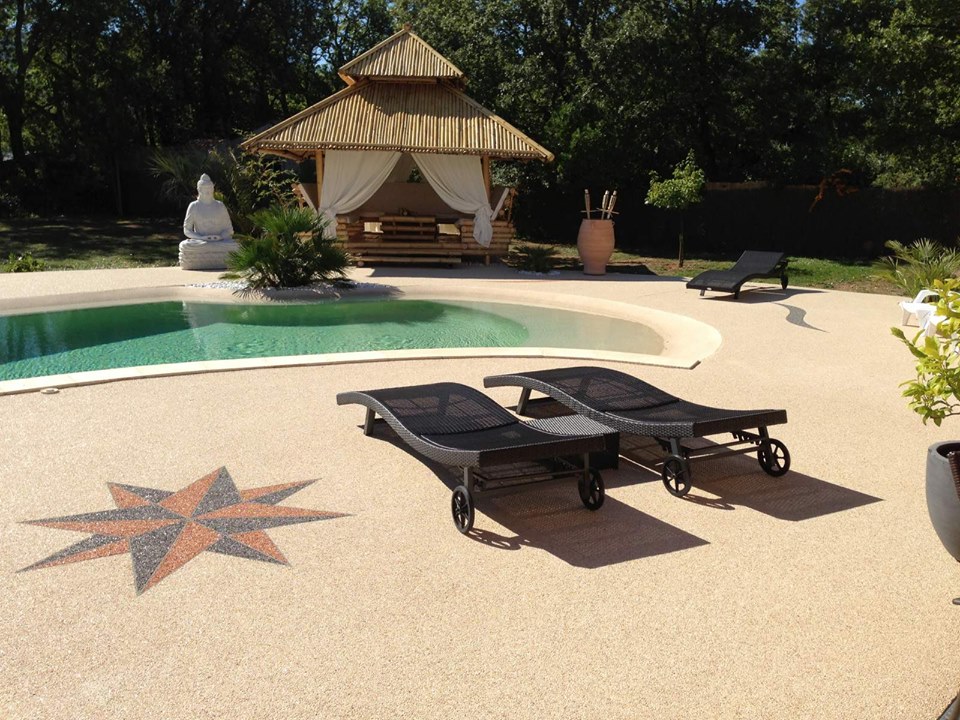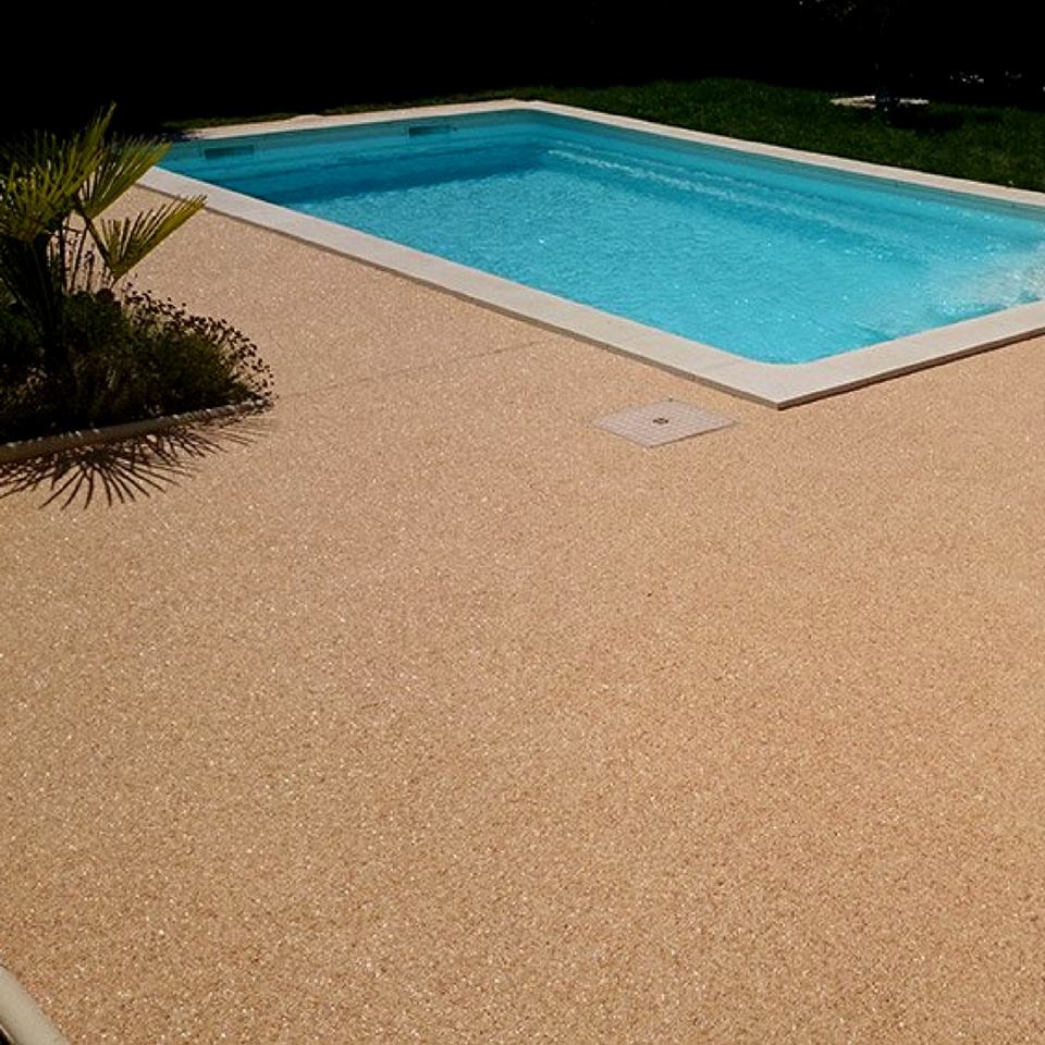 Réalisation de plages de piscine en tapis de marbre, revêtement drainant évitant l’eau stagnante et les glissades, idéal en tour de bassin.